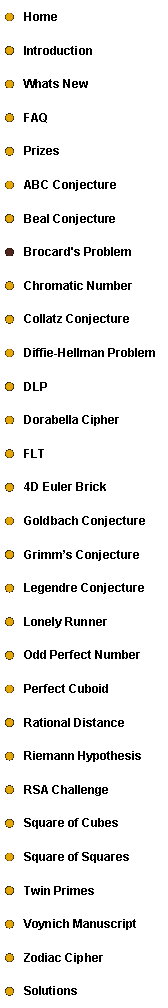 Brocard’s Problem concerns the equation n! + 1 = m2 where n and m are both integers, and n! Is the factorial of n, that is, the product of all integers less than or equal to n (so, for example, 3! = 3*2*1 = 6, and 4! = 4*3*2*1 = 24, etc). Only three solutions to this equation are known, when n = 4 or 5 or 7. The problem is to find other values of n for which this equation is true, or to prove that there are no other solutions..