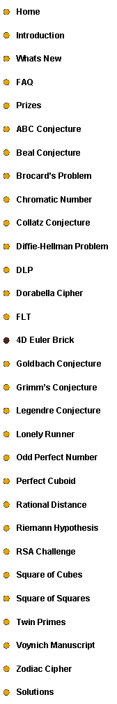 So if the length, depth and height are a, b, and c respectively, then a, b, and c are integers, as are the quantities √(a2+b2) and √(b2+c2) and √(c2+a2). The problem is to find a four dimensional Euler Brick, in which the four sides a, b, c, and d are integers, as are the six face diagonals √(a2+b2) and √(a2+c2) and √(a2+d2) and √(b2+c2) and √(b2+d2) and √(c2+d2), or prove that such a cuboid cannot exist .